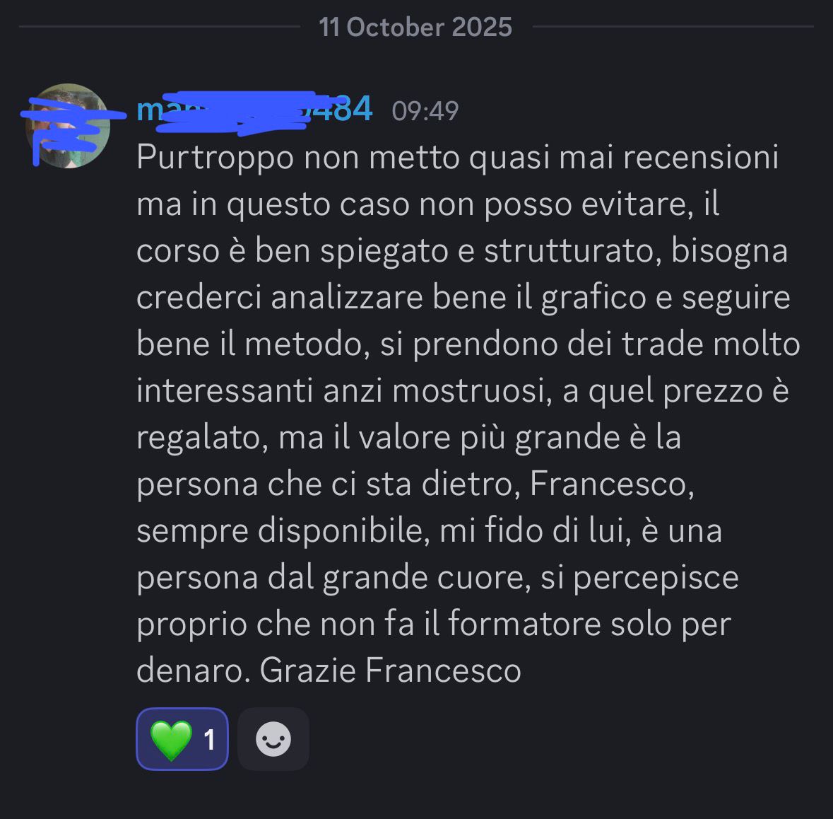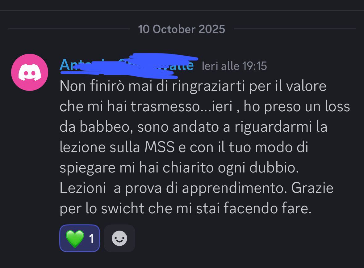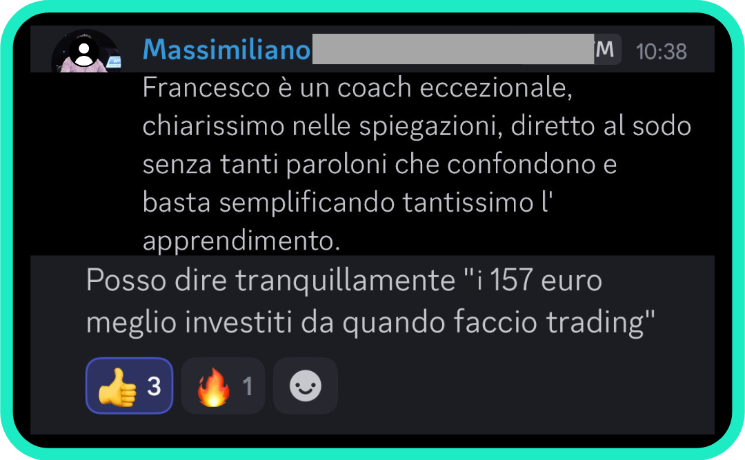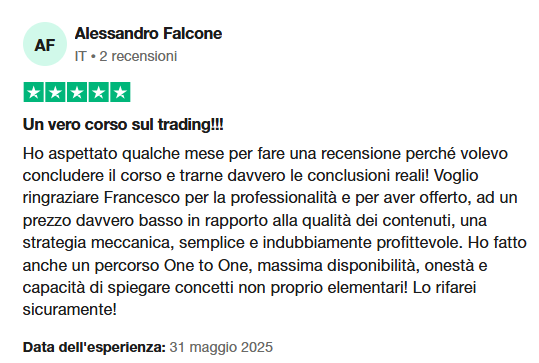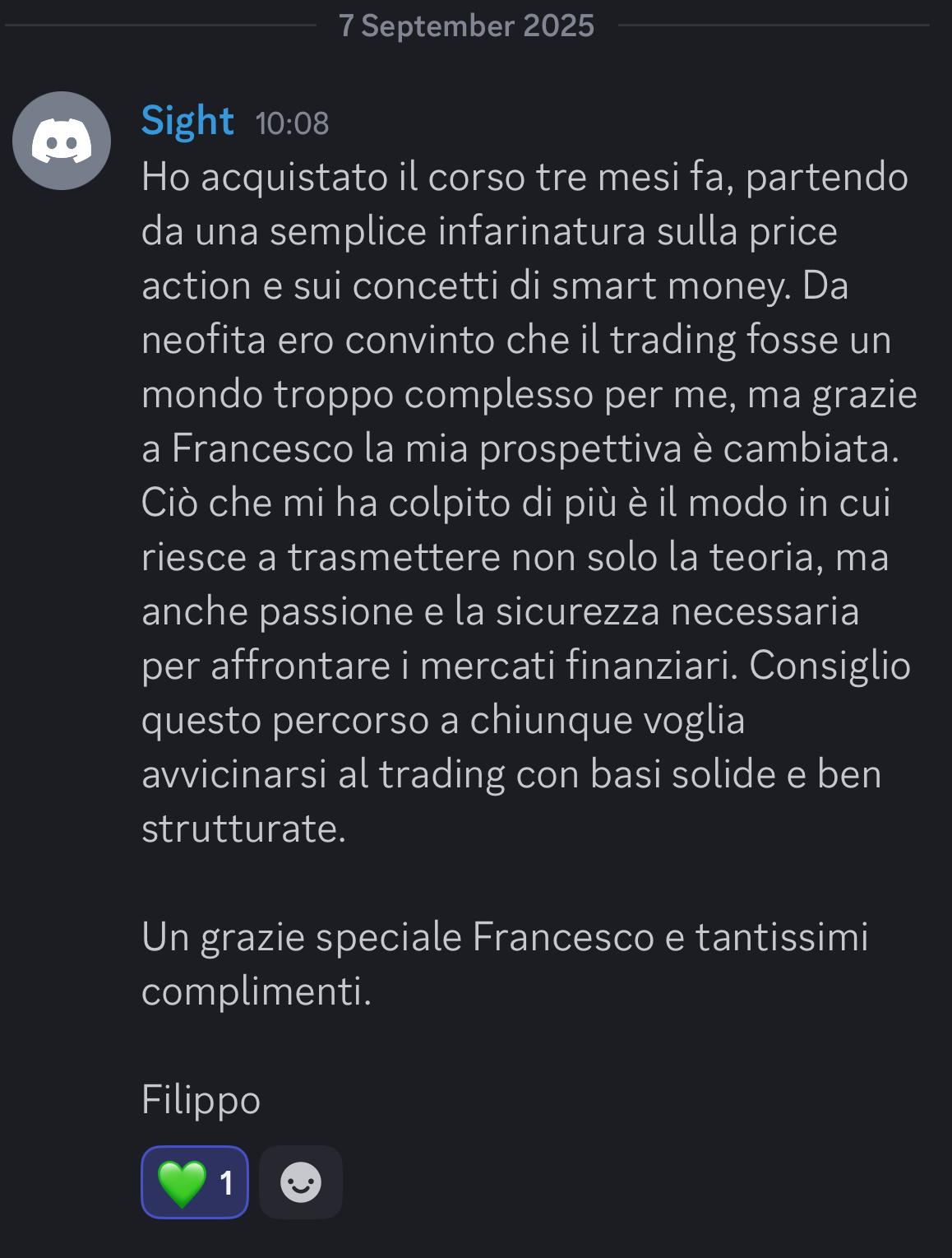Ciò che mi ha colpito di più è il modo in cui riesce a trasmettere non solo la teoria, ma anche passione e la sicurezza necessaria per affrontare i mercati finanziari. Consiglio questo percorso a chiunque voglia avvicinarsi al trading con basi solide e ben strutturate
