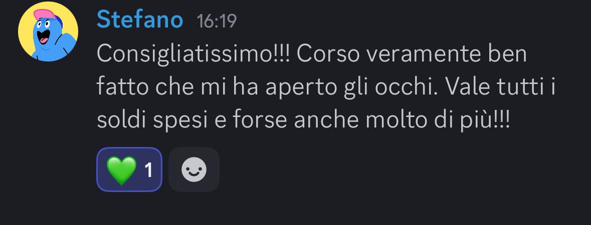 Consigliatissimo!!! Corso veramente ben fatto che mi ha aperto gli occhi. Vale tutti i soldi spesi e forse anche molto di più!!!